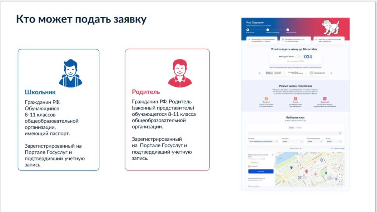 В онлайн-формате могут обучиться жители всех регионов России. Наличие в регионе классов для очного обучения можно уточнить на интерактивной карте на сайте проекта https://www.gosuslugi.ru/futurecode.